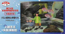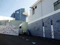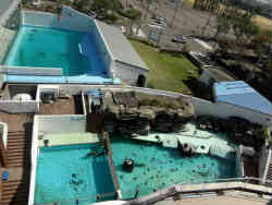 右はもう一つのエサやりショーでマリンジャンボ水槽で上からエサが巻かれます。主にアミエビらしきエサを投下して魚たちが乱舞していく様相です。左の外壁はかわいいらしい魚や貝等を描いて(貼り付けて)おり子どもには人気があると思いますがやや古い感は否めません。 | ![]() |