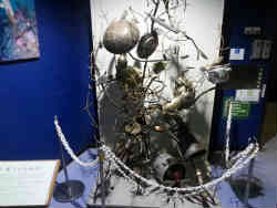 屋上は展望台にもなっており日本海含む光景が広がっており、右写真では先ほどのペンギン館の向こうにもうひとつのプールがありますが、夏季だけのイルカショーが開催されるものです。現在では夏季では無いので開催されていません。左は松原弘己氏(長野県在住)が製作したオブジェで海の無い長野県の方が海を想像して製作した金物の芸術品です。身近な台所用品(鍋やフライパン・フォークやスプーン)を使って魚貝類を模しています。 | ![]() |