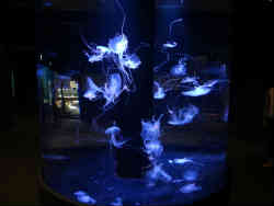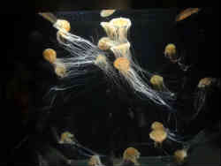 右はアカクラゲで左はアマクサクラゲです。その他一般的なミズクラゲやタコクラゲ等同じような丸い円筒形の水槽にて展示されています。非常に綺麗な展示です。 | ![]() |