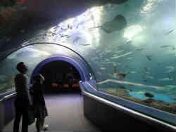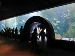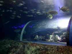 次はメインとなる日本海というエリアのマリントンネルです。大きな水槽の中にトンネルを作りまるで水中にいるかの様相です。中にはブリ・イサキ・クロダイ・ムズラハゲなどが泳いでいます。色々な水中トンネルを見てきましたが、水質が少し濁っているかなと言う印象です。 | ![]() |