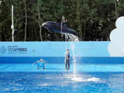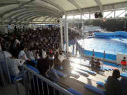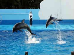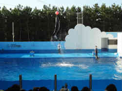 さて待望のイルカショーです。プールの広さは一般的ですが、その割に観客席は広いと思います。左はイルカを立ち泳ぎさせて人間(調教師)との大きさを披露しています。 | ![]() |