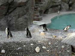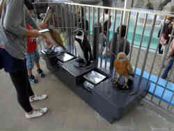 これはペンギン海岸と名うって細長い敷地にペンギンが居ます。水中や陸地と小屋の中とさまざまなシチュエーションで身近にペンギンを観察することができます。どこもペンギンは強烈な悪臭を放ちますがここはマシな方です。右はペンギンの模型で重さを計ることのできるコーナーです。ペンギンは水中に潜り易くするため思ったよりか体重が重いのです。普通の鳥と比較したら2倍以上重いと思います。 | ![]() |