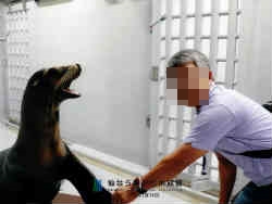 右は高いボール(赤色)を尾ひれでタッチというジャンプです。通常の鼻でタッチよりかジャンプ力が必要となります。右はスタジアムバックヤードツアーでアシカ君と握手する私(顔はモザイク掛けています)です。あとで気に入れば一枚千円で購入します。一応記念(ネタのため?)で購入しました。 | ![]() |