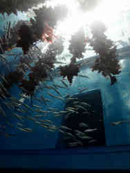 当然日本一新しい水族館ですから施設は綺麗そのものです。入場するとすぐにバークヤードツアーのチケットを購入します。ここのバックヤードツアーは一般的なものとアシカイルカショーのスタジアムの2種類有り(これは初めてですね)で両方とも購入します。入ってすぐに三陸名産牡蛎の養殖を模した展示があります。約70枚ほどのほたて貝を連でぶら下げ牡蛎の貝を養殖していきます。回りには小魚が群れで泳いでいます。 | ![]() |