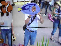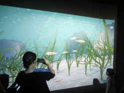 右は「海藻のような海の竜」と言う意味の大型タツノオトシゴの仲間です。オーストラリア南部とタスマニア島に生息する絶滅危惧種です。左もおもしろい企画で、モニター(鏡)に映った人間の顔を判断してバーチャルな魚を顔の部分に表示してくれます。私はそれを手持ちのデジカメで写していますが、この写真をネットで一週間以内にダウンロードできる仕組みもあります。モニターのシャッターを押して十数秒間の間にQRコードを写しネットに入ればOKです。 | ![]() |
