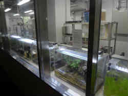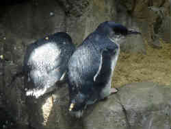 見学コースの途中には研究ラボを見るコーナーがあります。後で見るバックヤードも非常に綺麗です。左はフェアリーペンギンでコガタペンギンとも呼ばれ世界一小さなペンギンです。重さは約1kg程度で生息地のオーストラリアやニュージランドでは民家の軒下にも巣を作る事もあるヒトに身近な種類です。 | ![]() |