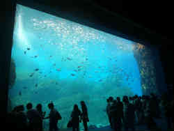 この水族館最大で「いのちきらめくうみ」と題された水槽です。魚の種類はあまり多くありませんが目玉は、約2万匹のイワシの大群です。「スパークリングオブライフ」と名うってエサを数カ所から放出コントロールしイワシの群れが大きく泳ぎ回るというパフォーマンスも見せてくれます。右写真は1Fのからですが2Fからは座って見学もできます。 | ![]() |