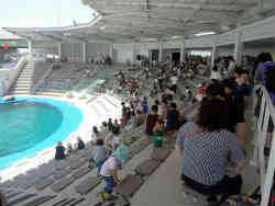 右は舞台から見た観客席です。滅多に見ることができません。左はどこでもある触れあいコーナーですが、他と違うのは入る場所が砂浜と岩(水辺)なんです。そこへ子供たちが裸足で入ります。もちろん近くに手足を洗う水道場があります。水たまりにはブクブクで酸素供給していてそこにいる魚は小さなサメです。もちろん噛みつかないと思いますが、子供たちはビビリ係員のお姉さんに諭され入っていきます。 | ![]() |