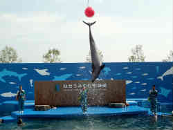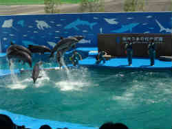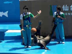 右は珍しいコラボ演技でイルカがボールを水面からアシカに向けて鼻を使い放り投げて、アシカが鼻で受け止めるというパフォーマンスです。上手くいくときといかない時があります。私はこのショーを2回見ました。あとは定番のアシカとイルカのショーです。気になるのはプールが小さいためか訓練不足なのかわかりませんがイルカのジャンプ力(高さ)が全般的に低いと言うこととショーの時間がやや少ないかと言うことを感じましたね。 | ![]() |