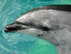 スタジアムバックヤードツアーでは観客席とは反対の舞台側へ誘導してくれ、色々と説明を受けたり、イルカと戯れることができます。間近でイルカを写すこともできます。また裏側ではイルカの調教方法をやさしく説明を受けたりもします。調教は簡単なことから条件反射を応用します。そう「パブロフの犬」の応用です。エサと動作と笛で褒めながら調教します。そして段階的に技能を高めます。一旦笛で反応すると次回からは笛のみで演技を披露することができるほどイルカの知能は高いんです。 | ![]() |