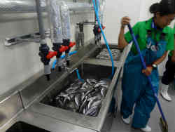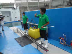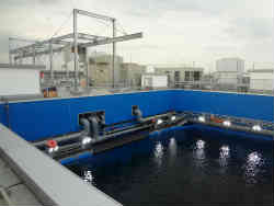 右は先ほどの大水槽の上から見た所です。左上には大きな魚を運んで入れるクレーンが付いています。また屋根がありません。思ったほど魚は天候のせいもありほとんど見えません。左は給餌室の様子で明日のエサ(主にアジとイワシ)を解凍している所です。それぞれの動物のバケツが有りかなりの量を与えています。エサの大半が冷凍ですので安上がりになっているとのことです。冷凍庫の中も見させて貰いましたが、マイナス20数度なので一瞬の入室でした。なおこの水族館の海水は近くの海岸から毎日トラック10台にて運んでいるそうです。 | ![]() |