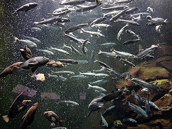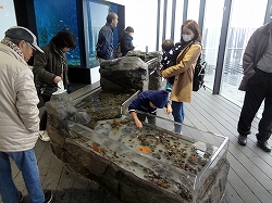 次に水槽の見学です。海水魚の展示です。あまり大きくはありませんが水質はきれいです。左はどうしても気になり撮ってしまいたいアオリイカの展示です。ホバリングする様子を観察します。我々が足と思っているところの奥に口があり、こちらが頭側かなと思います。逃げる時はヒレ側からですが、近づく(エサに)時は足側から近づきます。意外と素早い動きですね。 |