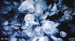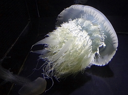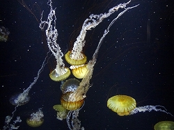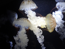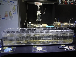 右はビゼンクラゲで以前はスナイロクラゲと呼ばれていたそうだ。以前日本海で大量発生したエチゼンクラゲに似てますね。左はクラゲ栽培センターのコーナーでクラゲがふ化から徐々に1日単位で大きくなっていく様を水槽で見ることが出来ます。研究ラボみたいだが、近寄って見ることが出来ます。 |