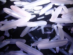 右がシンカイウリクラゲで瓜に形に似ています。庄内浜では春に浮いてきて表層で見られるそうです。左は小さいのだがベニクラゲと言って不老不死のクラゲとして有名だそうで、クラゲとしての寿命が尽きてもポリプ(クラゲの幼魚状態)に再生しまうそうです。 |