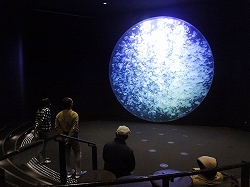 右はプロカミアジェリーで傘径50cmにもなり、最大は1mにも達するそうだ。左が一番の目玉でクラゲドリームシアターで直径5mの円形の水槽で、世界最大クラスだそうだ。中にミズクラゲが大量に入っており、時間とともに7色に変化して楽しませることが出来ます。天皇両陛下も視察に来られたそうだ。 |