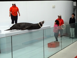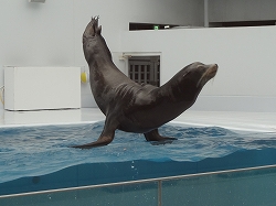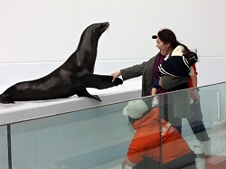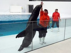 海獣エリアでアシカショーが始まります。待った甲斐がありましたが、生憎の冷風で身体がすっかり冷やされました。アシカは計2匹で登場し、一般的なあいさつから逆立ち・塀登りをしていきます。輪投げも一般の客を呼び実施していきます。 以下写真のみです。見学客は20人程度です。 |