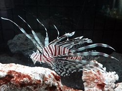 右は座礁した大型船だと思うが、海底には重機などのプラ模型が配置されている。左はきれいなミノカサゴであるがもちろん名前の表示は無い。学術名は関係なく美しい魚が光のイルミネーションと共存している。 会場はタッチプール・ファンタジーゾーン・ジャングルゾーン・は虫類ゾーンとあり、最後はカフェレストランがあったが客はゼロだった。 今までで最初で最後の変わった水族館であり、むしろ水と光のテーマパークだった。 |