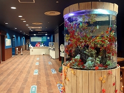 そして中に入るとこれまた超ド派手な水槽が並べられており、とにかく装飾と光が派手である。また一般的な水族館と決定的に違うのは魚の名前の紹介や生態等は皆無であるという所だろう。学術的な水中生物の展示と研究成果発表あるいはもちろん繁殖という一般的な水族館がもっている物は皆無である。 |