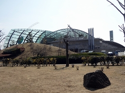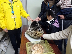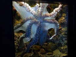 普段横から見ている水槽の上から眺めたり、裏方の搬入トラックやフォークリフト等も見れました。またここも震災の被害を受け、1m以上の浸水で大方の魚たちは、電源喪失の影響で死んだそうです。地盤沈下の場所も有りでようやく水族館は復興できたらしいです。左はここで死んだゴマフアザラシの剥製です。大きなアンモナイトの殻もあります。 |