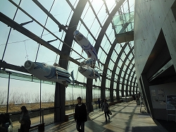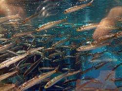 大きな透明のドーム状建屋の中に水族館があります。上には魚のモチーフが吊り下げられています。左はイワシの水槽です。一般的に多いのが丸い円柱状の水槽に入っているか、大きな水槽に他の魚たちと一緒に泳ぎ、トルネード魚群になって泳ぎます。ここはまた別で、イワシ専用の水槽ですが、横幅のある大きな水槽です。中に何万匹というイワシが群れで泳いでいます。 |