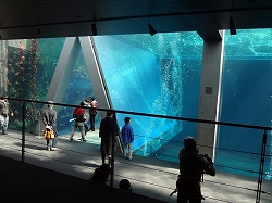 朝イチにホテル近くのレンタカー屋で半日借りて福島方面へ出発です。到着すると規模が大きいのが伺えます。そして今までに無い水族館の外観で、全体が透明のアクリルに覆われています。中に入っても明るい印象の近代的な建物のように感じられます。 |