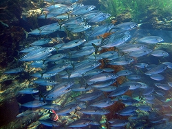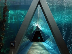 三角の水中トンネルはここだけだと思います。ニシン、スケトウダラ、シマソイ、エソメバル等がおり、左写真は群れで泳ぐサバです。親潮の流域という表現で、三角形のトンネルが「潮目「をあらわしているそうです。 |