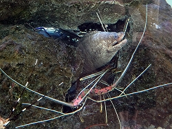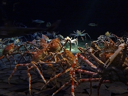 定番のミズダコとタカアシガニです。ミズダコの方は大きくて、足を広げた状態でおおよそ1.2mほどありそうです。タカアシガニの方は群れで今まで一番数が多いと感じています。とにかくこれほど多いと不気味さも感じられます。底引き網では一網打尽といった所か。 |