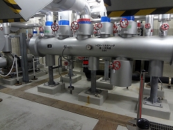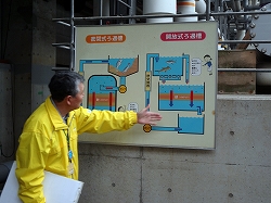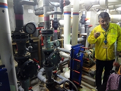 無料のバックヤードツアーに参加できました。ベテランの職員がおおよそ30分かけて案内して頂けます。私はこのような機会があればほとんどHPのネタとしても参加しています(もちろん興味もあります)。この水族館は海辺にありますが、海水の汚れを防ぐために、2kmほど沖合の海水を毎日ポンプでくみ上げて、浄化しているそうです。そして海水温調整がキモです。太いパイプと浄化水槽そして熱交換器が所狭しと並んでいます。 |