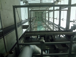 右写真は水槽を作っているアクリル板を接着した模型で、現在では日本製の物が使われ、このアクリルを接着する技術でガラス水槽では出来ない大型の水槽が世界に広まっているそうです。左写真は展望塔のエレベータでここもアクリルで透明になっています。カゴの中に入り下から上を見上げた所です。 |
