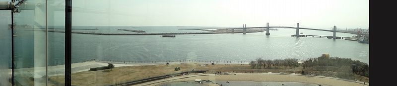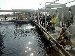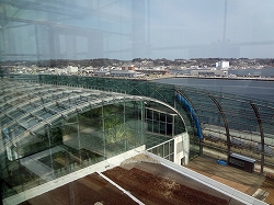 地上5階の風景です。周りが一望でき、太平洋側は海が望めます。この部屋もアクリルで覆われていますので、風や寒さは感じられません。左写真は魚釣りの「えっぐ釣り場」で体験ができ、釣った魚をその場で調理してもらい食することができます。有料なので内側から眺めています。見ていると魚は入れ食いの状態です。 |