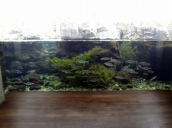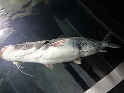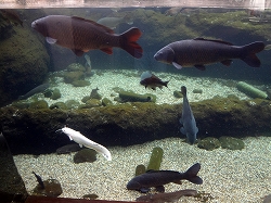 ここは淡水魚の水族館です。那珂川ゾーンの水槽です。うたい文句は「那須岳から自然豊かな那須野が原、八溝の大地を流れ下る那珂川が育む魚たちの生活を覗いてみて下さい」です。 |