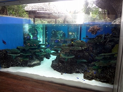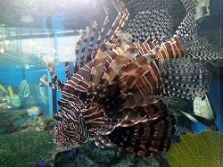 ![]() 上記アマゾン川のトンネル水槽では上の魚の腹がよく見えます。左の水槽は「あこがれの海ゾーン」で珊瑚礁がつくる美しく神秘的な自然世界。色鮮やかで個性的な魚たちが織りなす海の楽園が、目の前に広がります。が説明文です。 左はきれいなミノカサゴです。 |