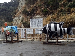 最終日電車で訪問しました。以前違う水族館巡りでこの房総半島を訪れた時は、展望塔の存在を知らなかったので2度目の訪問です。2時間以上の電車を乗り継ぎ田舎駅に到着です。入口には魚のオブジェが建っており、目を楽しませてくれます。 |