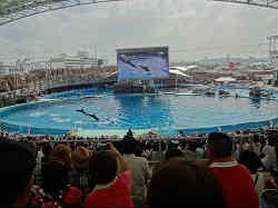360度円形ホールでのイルカと調教師との演技は凄い!。 ダイバーが水中でイルカの鼻先に乗かってそのまま水上へ飛び出しながらの空中ジャンプは見物。 | 34.エプソン品川アクアスタジアム(7) | ![]() |
