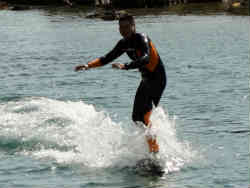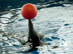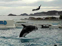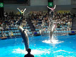 | まるで湘南の海でサーフィンに乗っているかのような名技。 浮き台に立ってその横をイルカを泳がせ飛び乗り、イルカの背中をまるでサーフィンのように乗り操る芸はすごい。このあと水中から水上へ出て垂直ジャンプも披露してくれる。 |