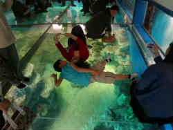 薄暗い海の上に乗る恐怖はまるで肝試し!。 幅1mほど長さ5m程度の床が透明のガラス(アクリル)板で、しかも薄暗い部屋の中、まるで透明の氷の上を歩くかの様相は恐怖?。 | 45.うみたまご(大分)(8) | ![]() |