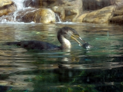 水族館での鵜の活き魚捕獲はここだけ?。 鵜飼いは岐阜県長良川や京都嵐山で有名ですが、ここでは鵜匠が操る鵜飼いでは無く、鵜そのものが実際に同じ水槽で飼われている(エサ?)小魚を水中に潜って追っかけ回して捕獲し食べています。ちょっと釘付けになります。 | 101.アクアマリンふくしま(7) | ![]() |