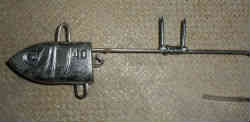 これが改造前のテンヤ40号です。右上が細い針金です。 下は電気工事用の電線を壁に留めるステープル(ホッチキスの玉の親分みたいな物)です。 | ![]() |