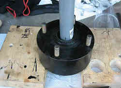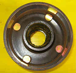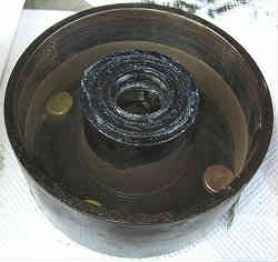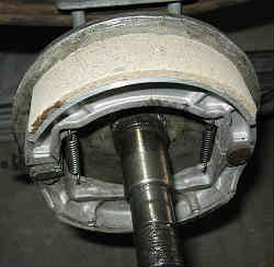ハウジングの取り外し:上記左に回しナットを外して次に特大ワッシャーを外します。次にハウジング(タイヤを留めているボルトが付いた大きな円筒形の物)を手前に引っ張り外します。(パーキングブレーキを引いていないかを確認) 簡単に外れない場合は奥の溝をマイナスドライバーで少しづつこじて外します(またはタイヤを付けたままで引っ張ると引っ張りやすい)。 外すと中には中央に車軸と外側にパーキングブレーキのライニングシュー(上下2個)が見えています。 ライニングシューは組み込む前に軽くサンドペーパー等で磨いておき汚れをとります(左写真)。油脂等は付けないこと。 | ![]() |