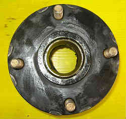 ハウジング:写真右側が中身すべて取り外した後のハウジングの表(タイヤを取り付けるボルトが出っ張っている)・ 左側はハウジング内側です。 ハウジングの内側も確認して錆があればサンドペーパーでこすっておきペイントします。ただしドラム内側のブレーキシューが当たる面はペイントしないようにする事。そして汚れを取り除きます。油脂が付いてしまった場合はブレーキクリーニングスプレーを吹きかけ油脂分を取り除いておきます。 | ![]() |