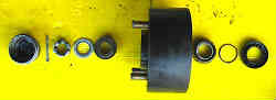 ハウジング内ベアリング取り外し: ハウジングを手前に取り外したなら、次に中に入っているベアリング2個(アウターとインナー)とオイルシール(内側からの水の浸入を防ぐパッキン)を取り外します。右写真は左(外)側からベアリングキャップ・割ピン・クラウンナット・特大ワッシャー・アウターベアリング・ハウジング・インナーベアリング・オイルシールパッキン・オイルシール | ![]() |