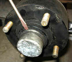 ベアリングキャップの取り外し: タイヤを取り外し(外さなくても出来る場合もあるが点検も兼ねて外した方が楽)、センターのベアリングキャップをマイナスドライバーでこねて外します。 この場合円周通りに少しづつ開いて外していきます。 | ![]() |